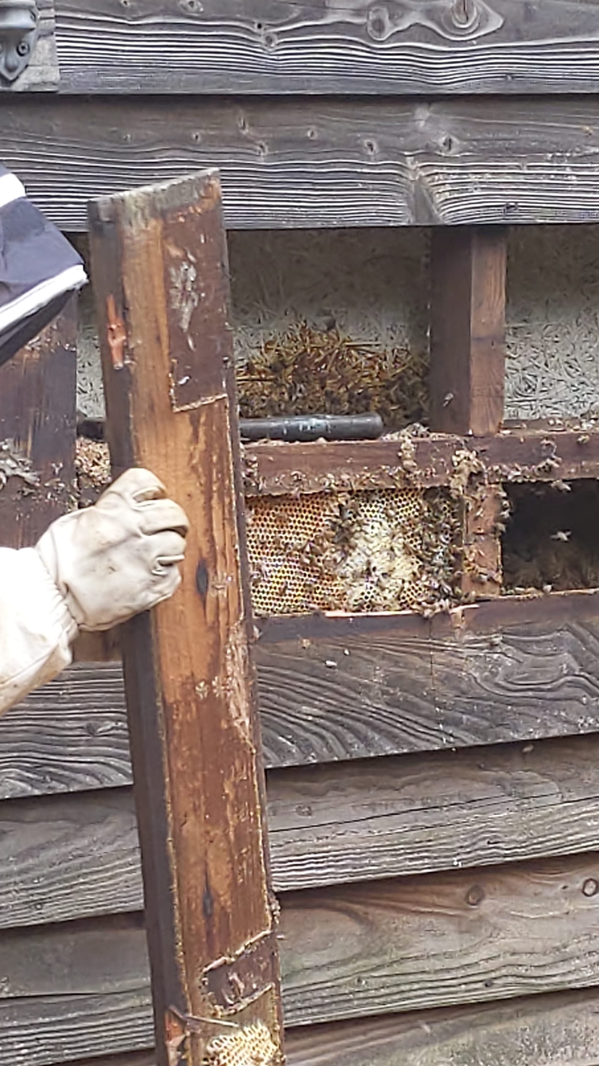 Gently we removed each piece of wood to show more and more of the beautiful comb they had drawn out. Lots of lovely honey and massive amounts of brood. We sliced up the comb with eggs and brood on and placed into frames and then the hive. This is so important to do this as it gives them a very good start somewhere else. Each piece of comb is strapped into an empty frame and placed carefully into a hive. Not long and the hive was full of lovely frames of sealed brood and eggs a perfect start for their new home.